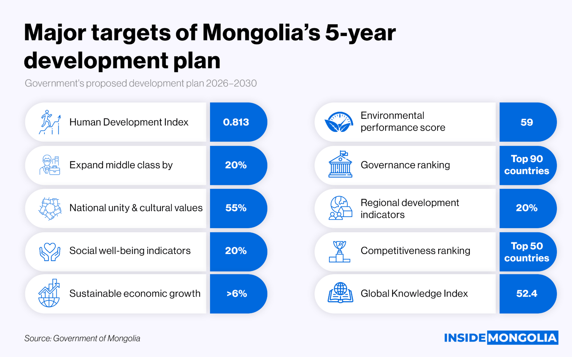 The Governmentās 5-year plan outlines 8 strategic policy directions designed to diversify the economy, enhance resilience, and improve citizensā quality of life. These priorities aim to achieve 10 key national outcomes within 5 years, including raising the Human Development Index to 0.813, expanding the middle class by 20%, increasing pensions by 8.6%, raising wages to 45.9%ā50.5% of GDP wage share, and placing Mongolia among the top 90 countries in governance rankings.