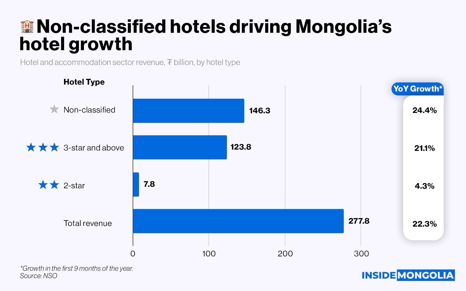 Mongoliaās hotel and accommodation sector continues to grow, with revenue rising 22.3% year-on-year to ā®277.8 billion in the first nine months of 2025.